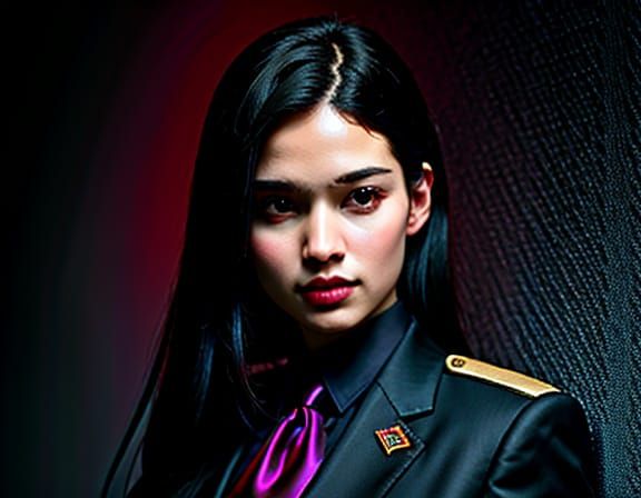 A stunning young woman with striking red eyes and black hair looks shocked and curious in a downtown setting, captured in warm, cinematic tones with intricate details and realistic skin textures.