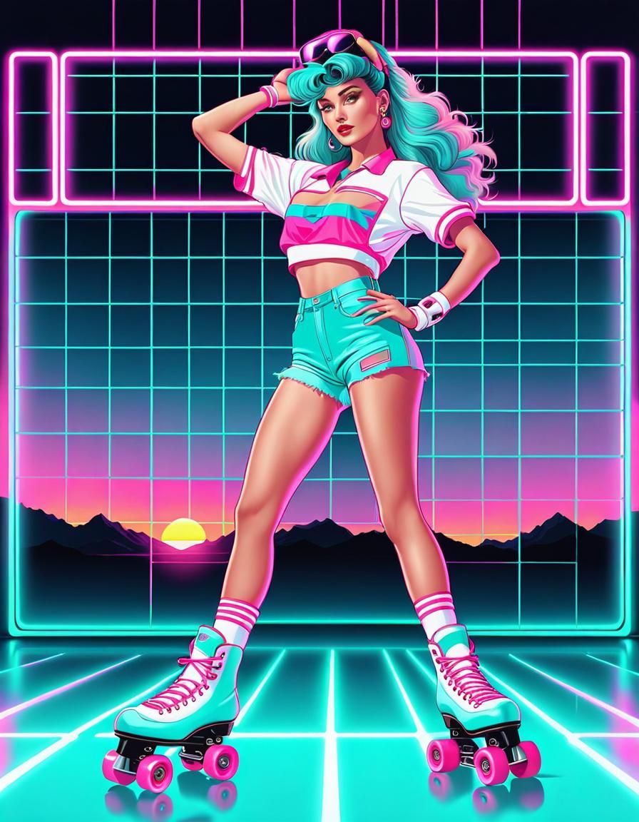 This image shows an 80s teen on roller skates against a sunset and retro computer grid backdrop. The image has a cel shaded vaporwave aesthetic featuring vibrant neon, pink, turquoise, and pastel colors.