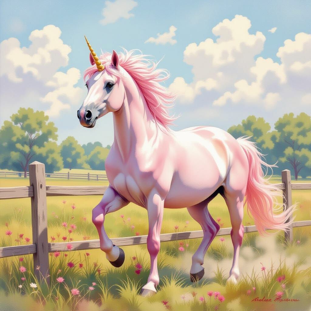 This image shows a pink pony in a hyperdetailed and beautiful romantic watercolor style. The pony's features are rendered with award-winning realism.