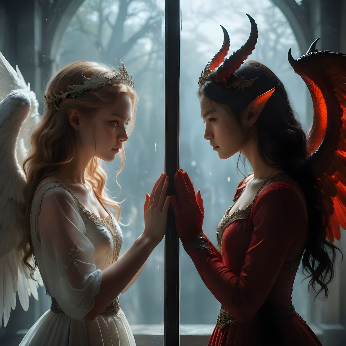 A fantasy image showing an angel and a demon girl separated by glass, reaching out to each other. Features cinematic lighting and intricate detail.