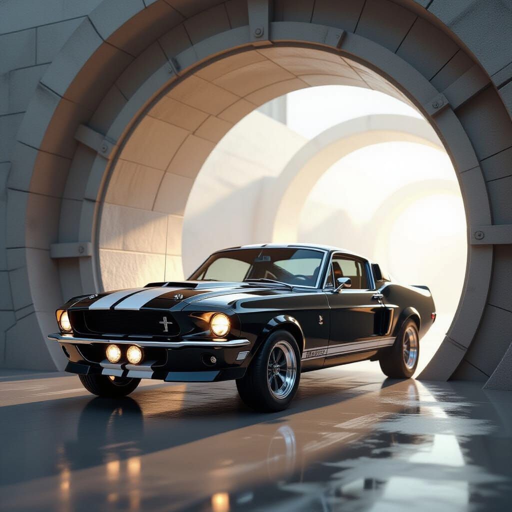 This image shows a classic black 1967 Ford Mustang Shelby GT500 emerging from a mysterious portal. The car has a futuristic design, blending vintage style with advanced concepts.
