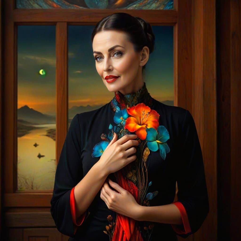 beautiful photorealistic lady in surreal fantastic landscape by Stefan Gesell, Angelina Wrona, Andy Kehoe, Salvador Dali, Max Ernst, René Magritte, Johfra Bosschart; glossy, clear, crisp, smooth, vibrant, colorful, high contrast, vivid colors, contrasting colors, triadic colors, vibrant colors, volumetric ...