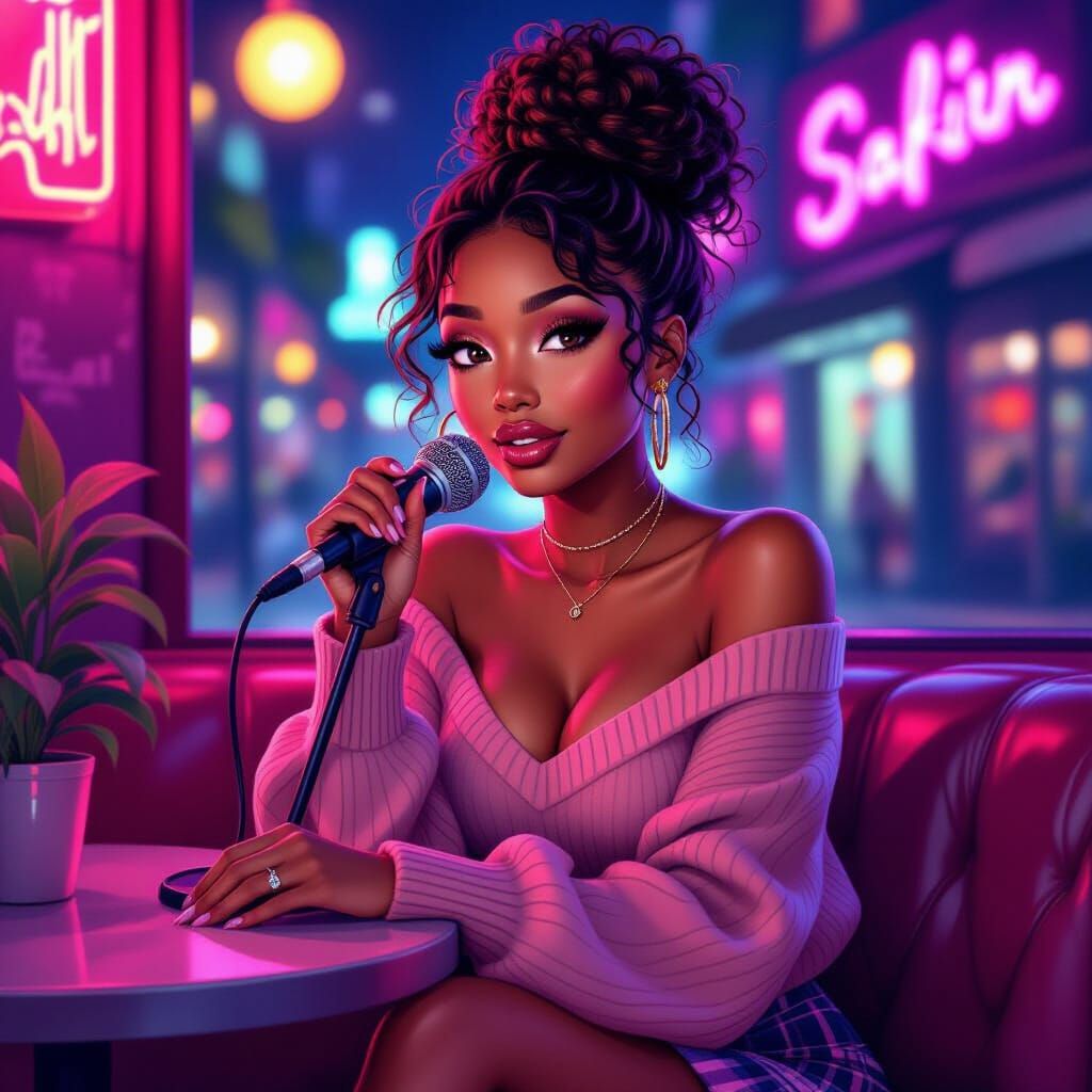This digital painting captures a cute Black ASMR influencer with deep brown skin, wearing stylish attire in a neon-lit cafe. The artwork features a cozy, flirty R&B aesthetic with warm pastel lighting, inspired by smooth textures and vibrant art styles.