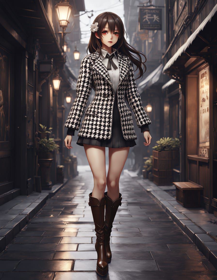 This captivating image depicts a stunning young woman with an hourglass figure, exuding elegance and poise. Her dark brown hair and olive-toned skin are set against a rich backdrop of a dark, old English alley, evoking a sense of mystery and allure. Inspired by the Mahou Shoujo Madoka Magica art style, t...