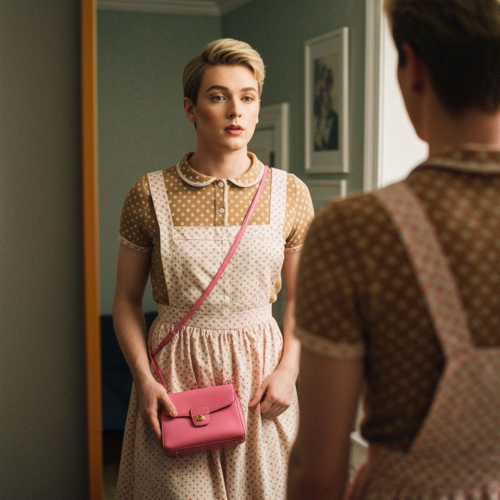 Cinematic film still of a young man in a vintage pinafore dress with light makeup and a pink purse, looking in a mirror. Atmospheric and dramatic lighting create a masterpiece.
