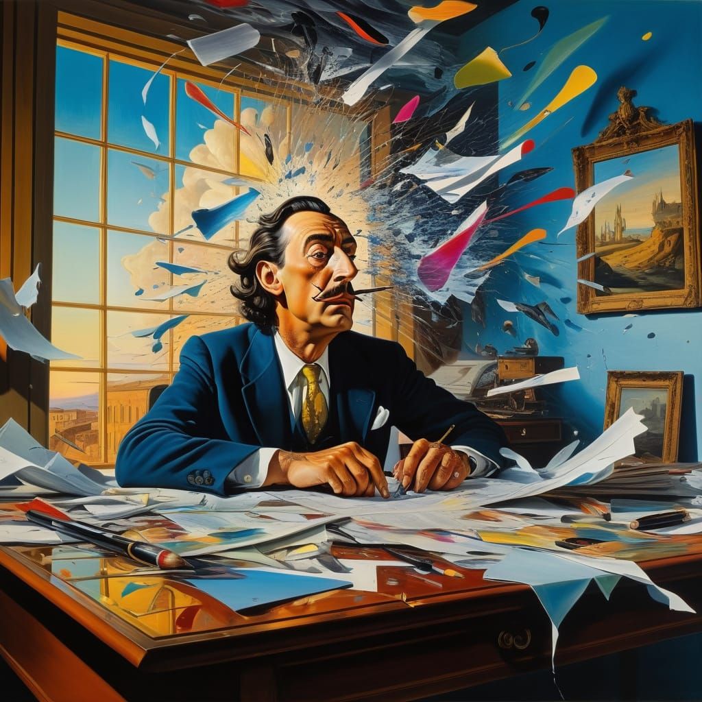 This image shows a close-up of a stressed office worker amidst a chaotic workspace, with a shattered clock and a swirling storm cloud outside, set against a background of a glowing computer screen, all depicted in a vibrant, distorted oil painting style with triadic colors and dramatic lighting.
