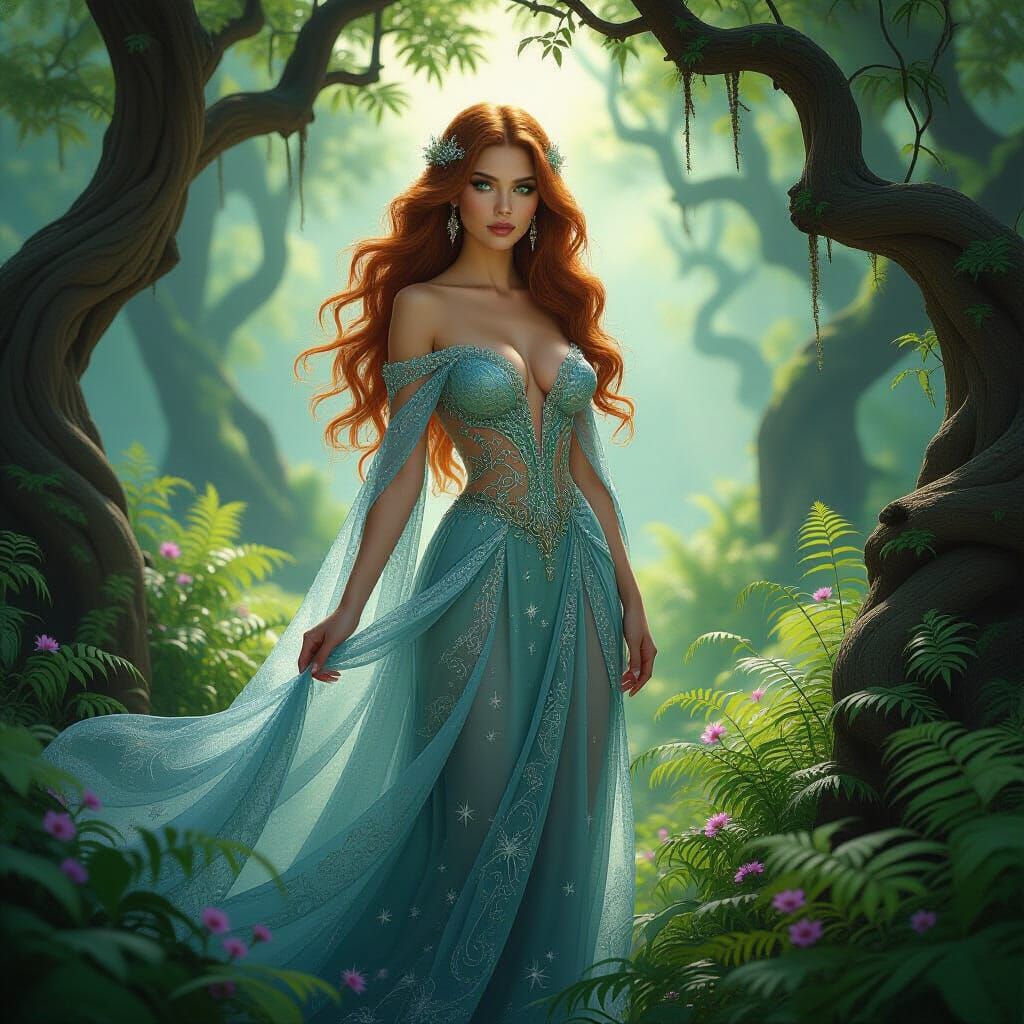 This image shows a beautiful woman in an elaborate starlight gown, standing in a misty grove. The style evokes classic illustration with an Art Nouveau aesthetic and soft, ethereal lighting.