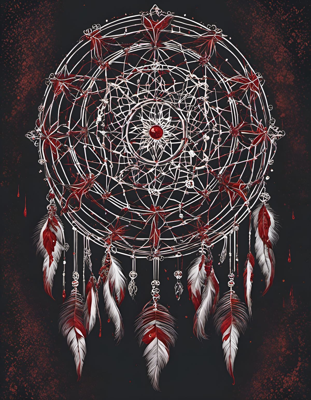 A hyperrealistic dreamcatcher crafted from bones and webs is featured. The gothic design is symmetrical, with dripping blood and guts, set against a dark background.