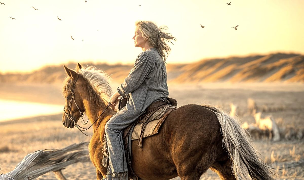 This image shows an elderly hippie woman riding a horse on an Irish beach. The scene is reminiscent of a detailed charcoal drawing, capturing the golden light and tranquil beauty of the landscape.