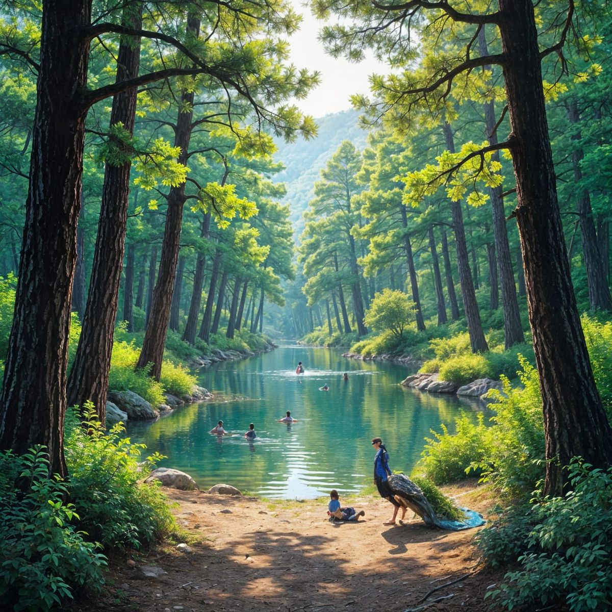 Easily create your own images of nature walks with pine trees, lakes, ducks, and peacocks for free.