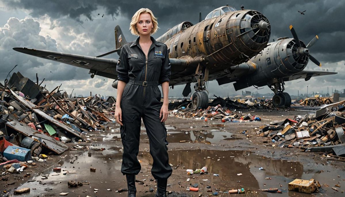 A hyperrealistic image of a blonde woman with blue eyes in a black aviator jumpsuit, standing before a WWII-era military aircraft in a grim, industrial wasteland. The scene is rich with intricate details.
