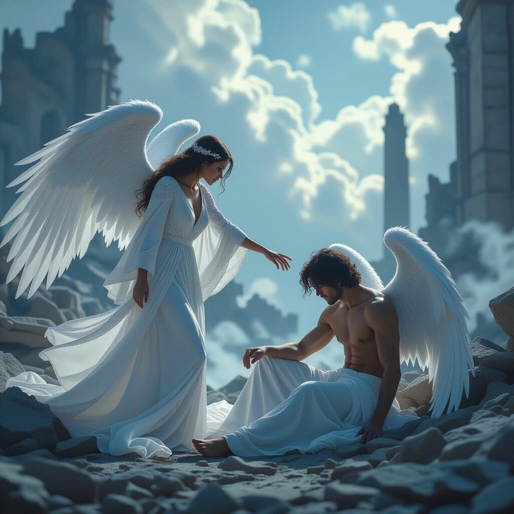 This image shows a female angel helping a fallen male angel amidst ruins. The artwork is highly detailed with dynamic lighting and vibrant colors, resembling a live-action film with a cinematic aesthetic.