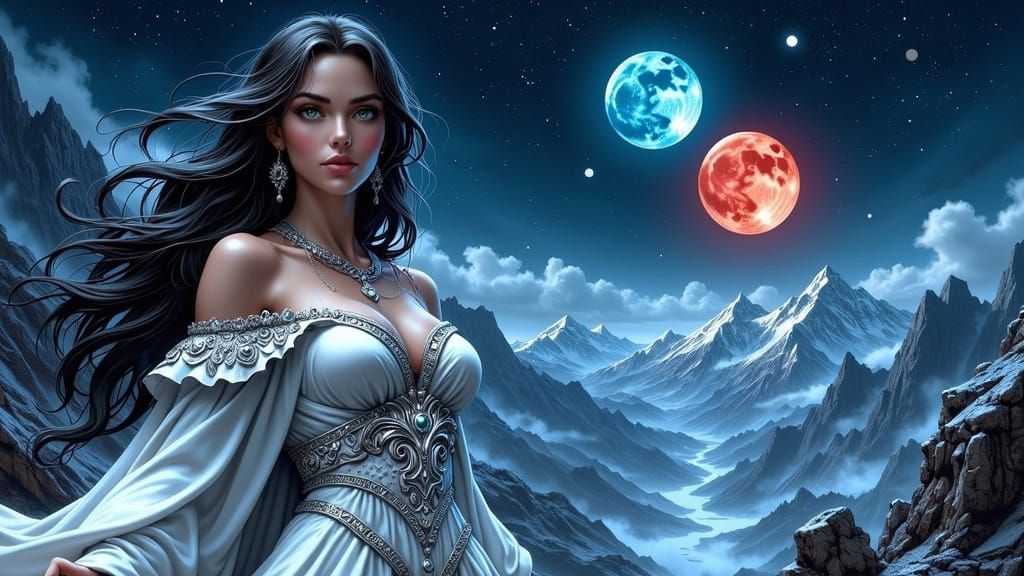 A highly detailed image of a powerful sorceress in white robes, set against a dramatic nighttime mountain background with three moons, rendered in a super-realistic style with vibrant colors and an eerie atmosphere