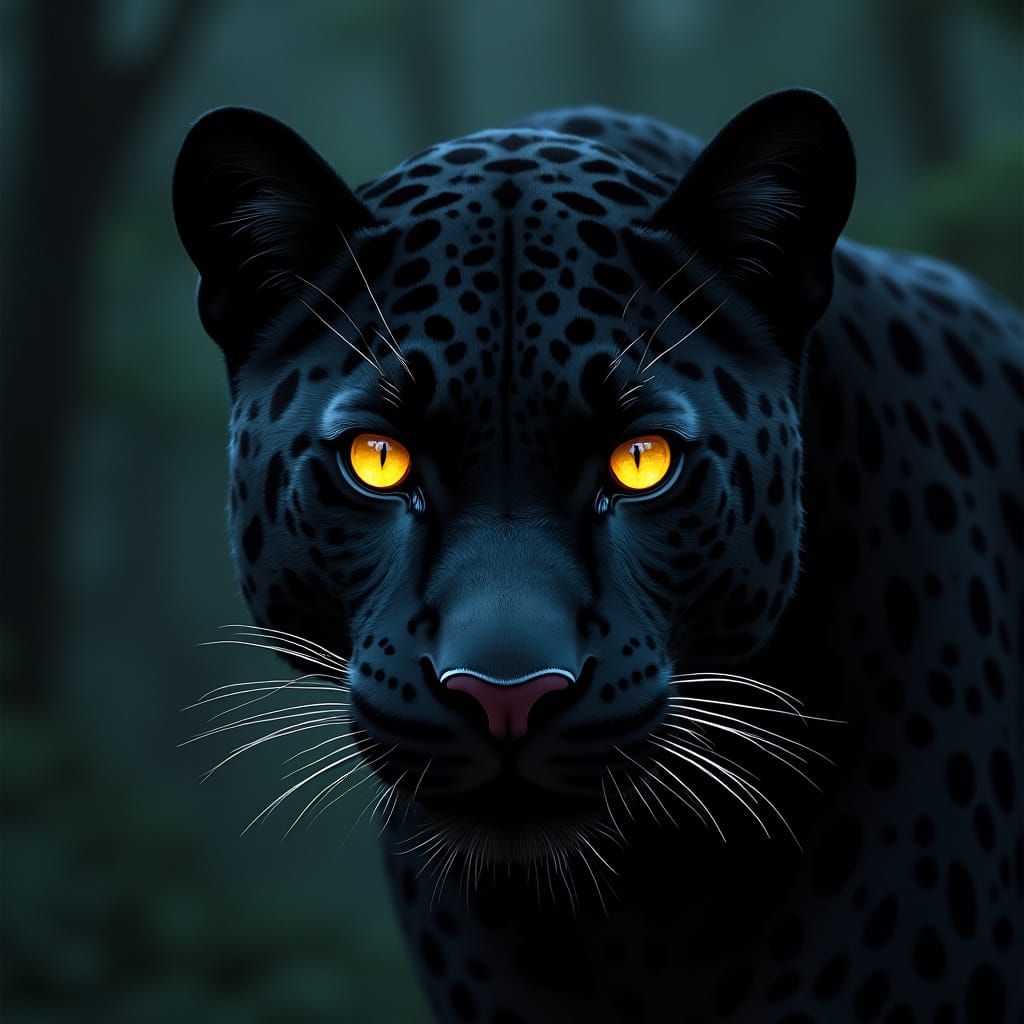 A striking picture of a leopard with black panther-like fur and piercing yellow eyes, set against a dark jungle backdrop. The image is reminiscent of digital painting with an expressive, mysterious atmosphere.