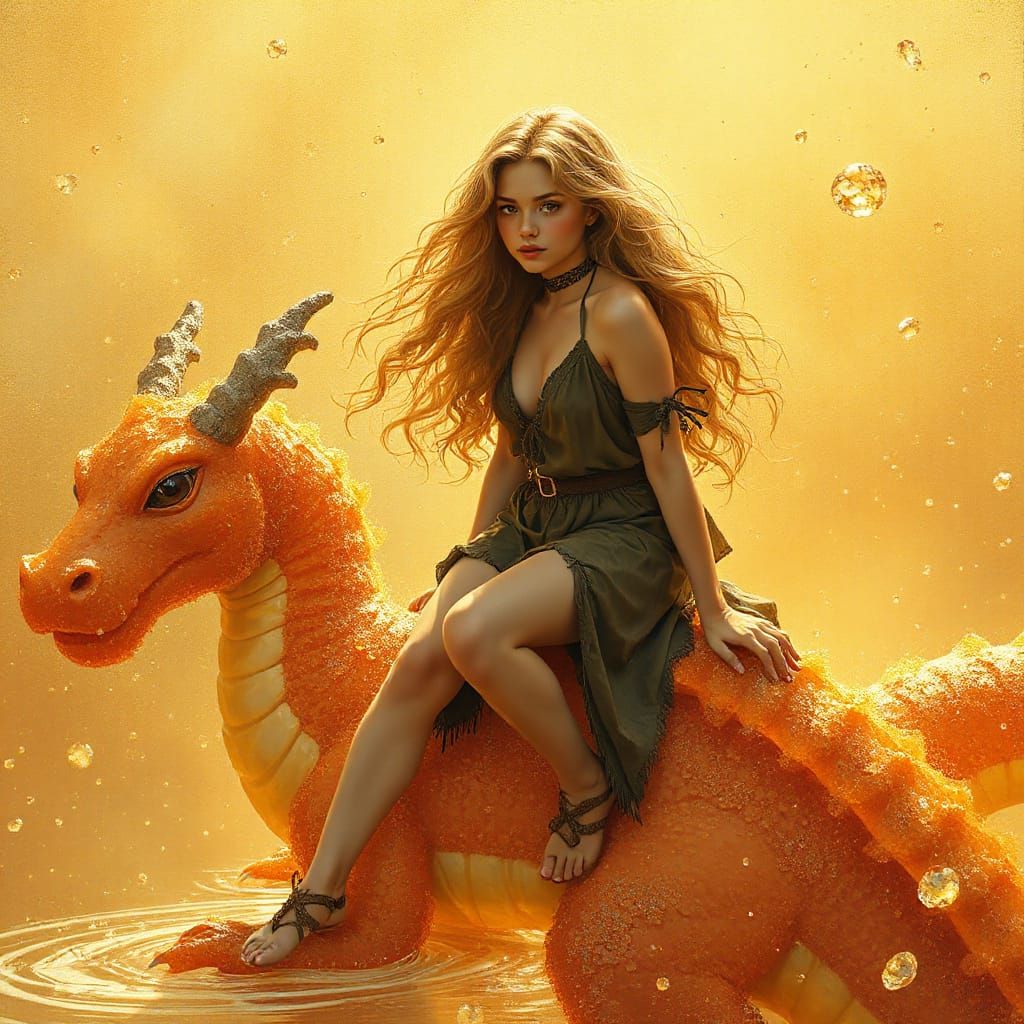 A serene woman with golden hair rides a giant gummy dragon in a bubbly soda sea. Features warm amber and tangerine tones with delicate linework, evoking art nouveau and imaginative realism.