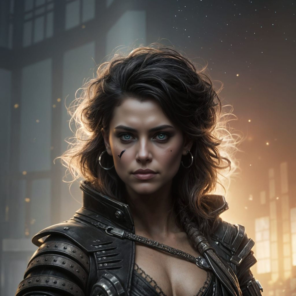 A striking picture of a beautiful galaxy pirate in black leather armor set against a galactic city. The cinematic image is rendered with film grain and dramatic lighting, in a cosmic horror style.