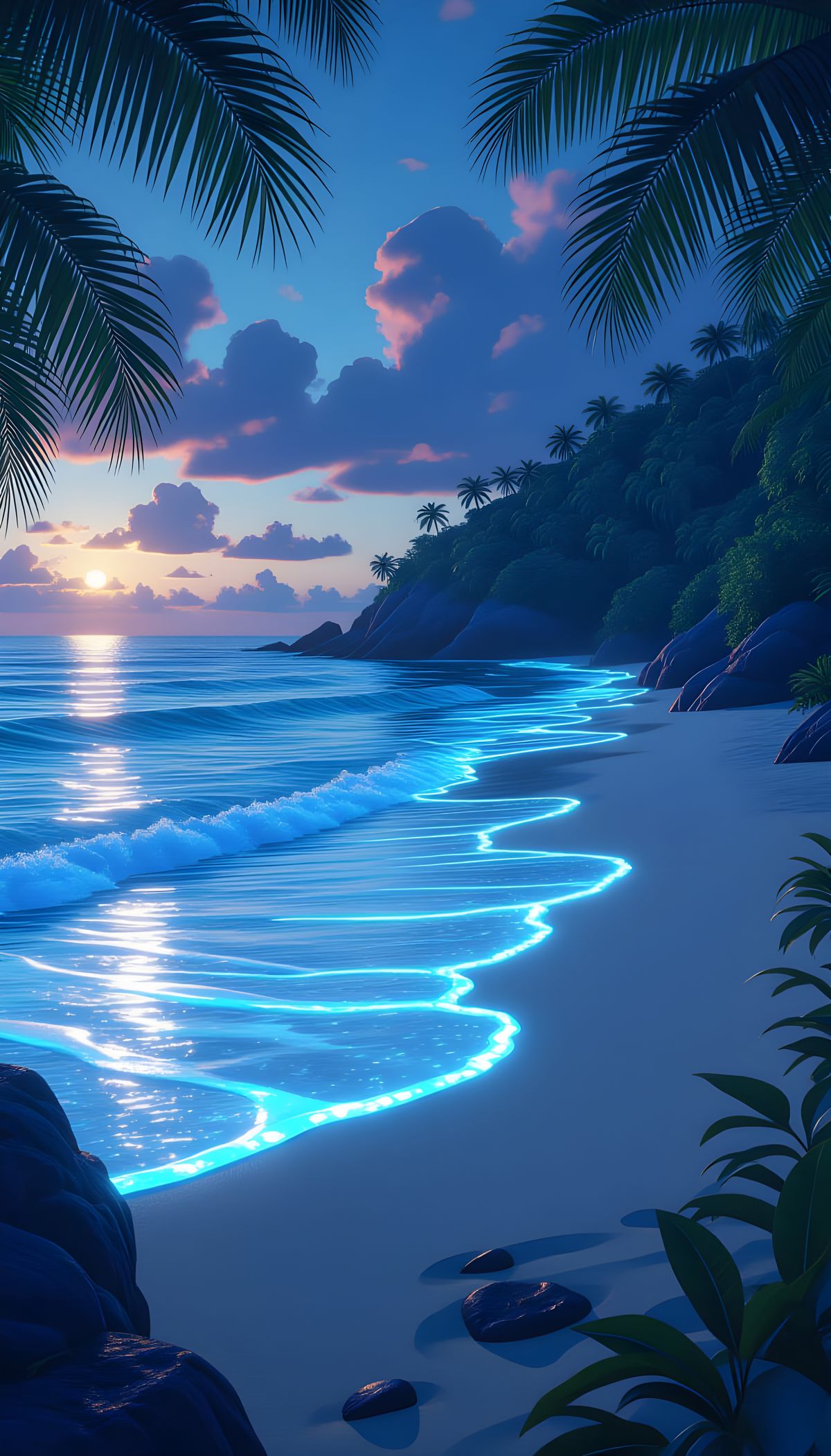 A captivating view of a bioluminescent beach where gentle waves meet the shore. The scene is enveloped in illuminated foliage, rendered in a mystical realism art style with vibrant colors.