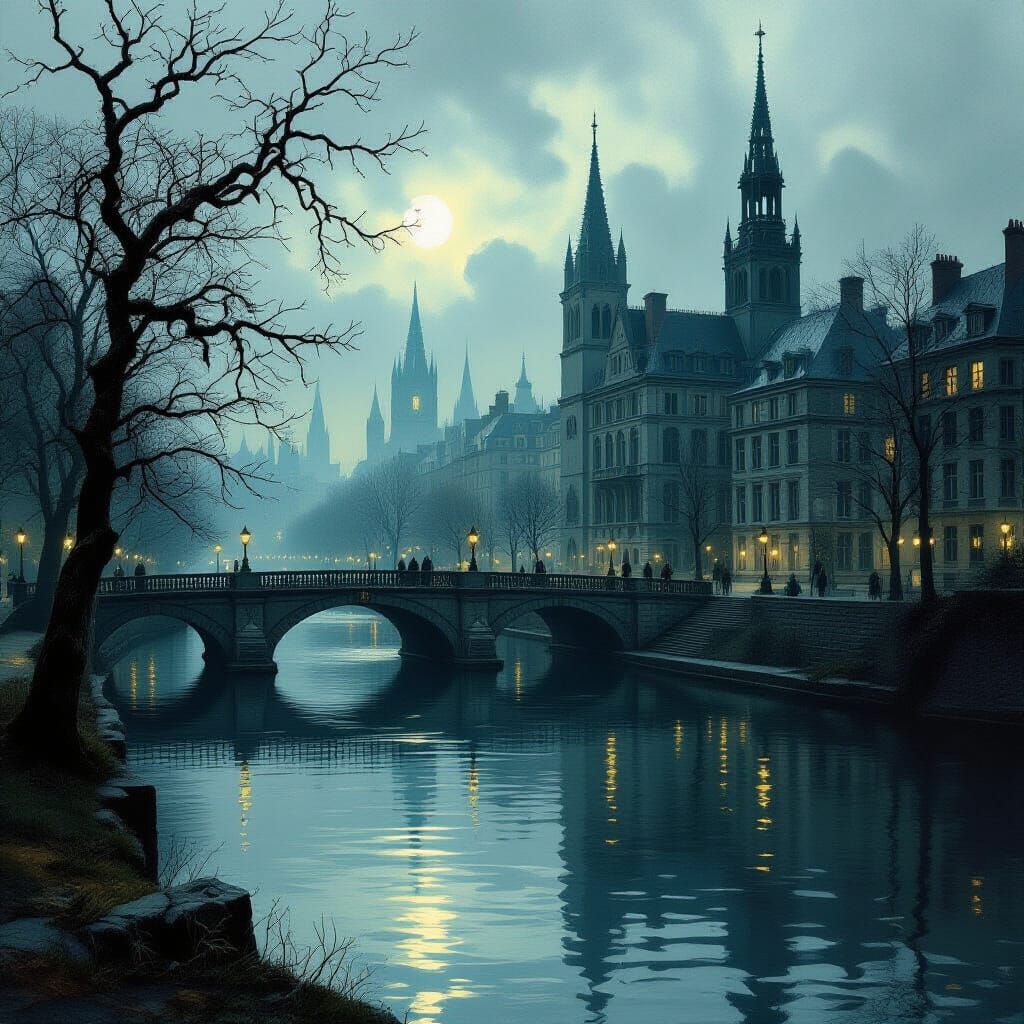 This image depicts a decadent city park rendered in a dark, horror-inspired style reminiscent of Gustave Doré's dramatic engravings.