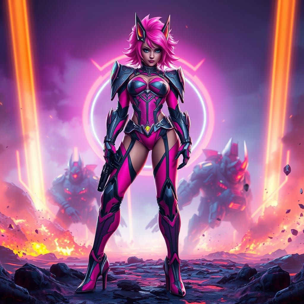 A stunning image of a confident female warrior in a cyber-fantasy outfit, set against a neon-lit battlefield with volumetric fog in vibrant hues, rendered in a hyper-detailed fantasy art style with dynamic lighting.