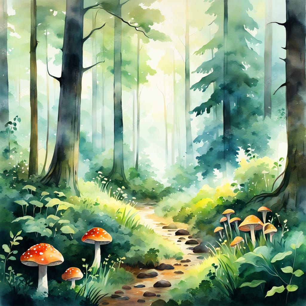 This serene watercolor painting captures a misty forest scene with towering trees and vibrant glowing mushrooms, set against a warm and soft gradient of morning light, evoking a sense of nature's tranquility and peaceful atmosphere.