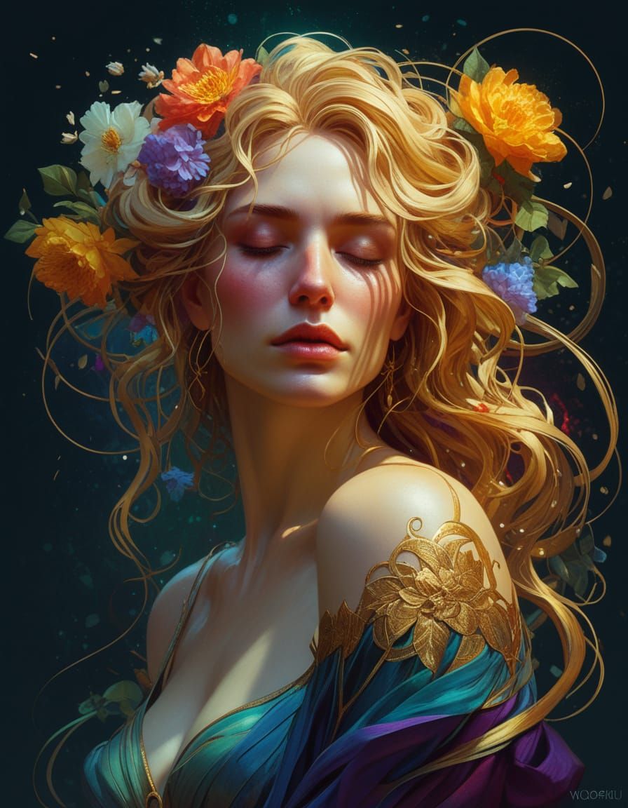 A detailed Art Nouveau painting of a provocative model with rainbow hair, framed by delicate flowers and golden ornamentation. Features an ethereal glow and deep, mystical colors, inspired by Klimt and Silivonchik.