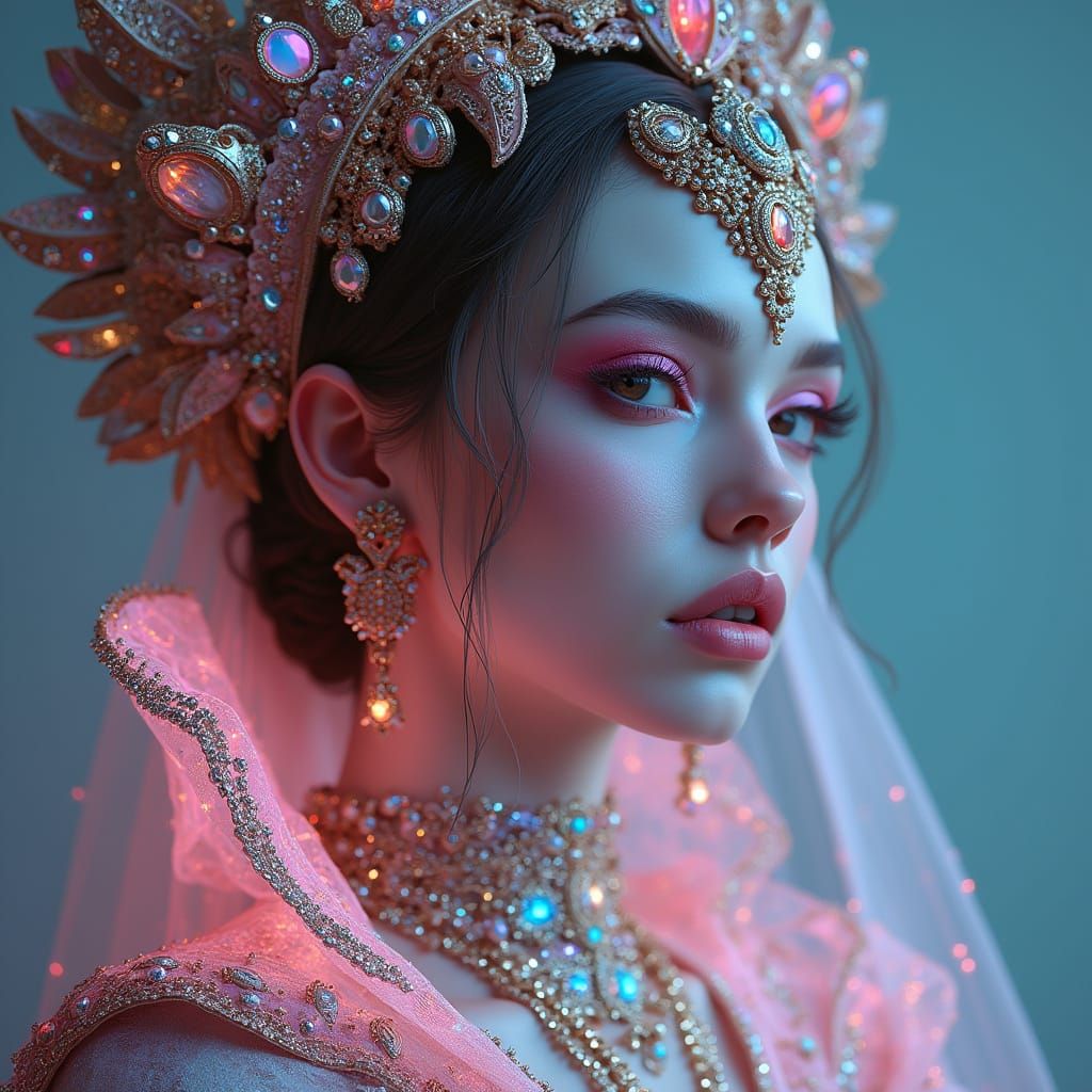 This image depicts a stunning woman with porcelain skin, wearing intricately detailed, colorful attire with Byzantine and cyberpunk elements, complemented by luminous jewellery that shimmers with an ethereal glow, set against a subtle, gradient background, evoking a sense of wonder and enchantment, remin...