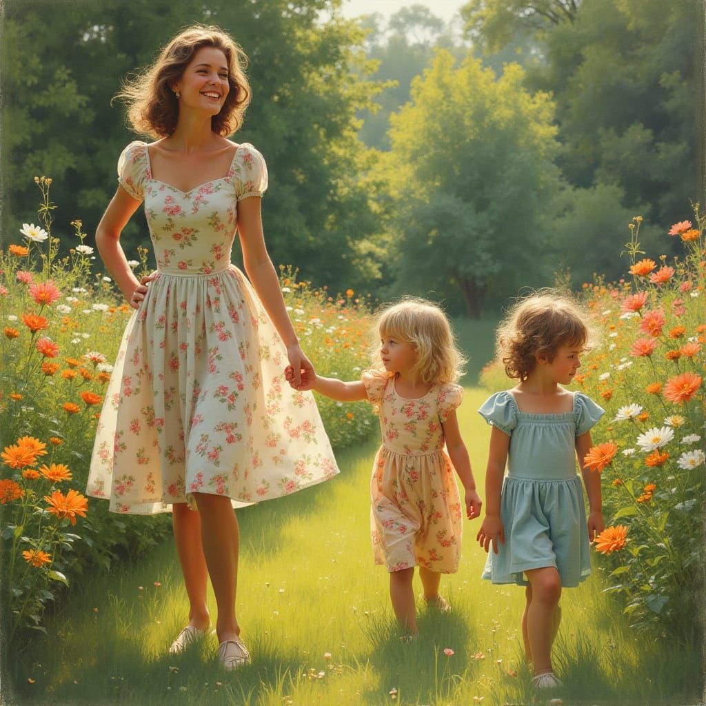 A heartwarming image of a woman in a 1950s-style dress, enjoying her children playing in a sunny flower garden. The artwork evokes a nostalgic Americana mood with soft, warm tones.