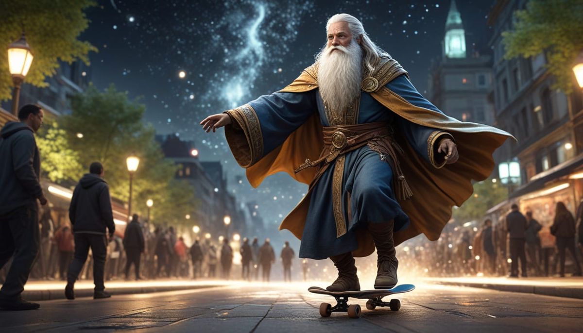 This digital illustration shows an ancient man with a celestial cloak performing a skateboard trick in a bustling park during golden hour. Stardust trails his board as cosmic energy emanates from him.