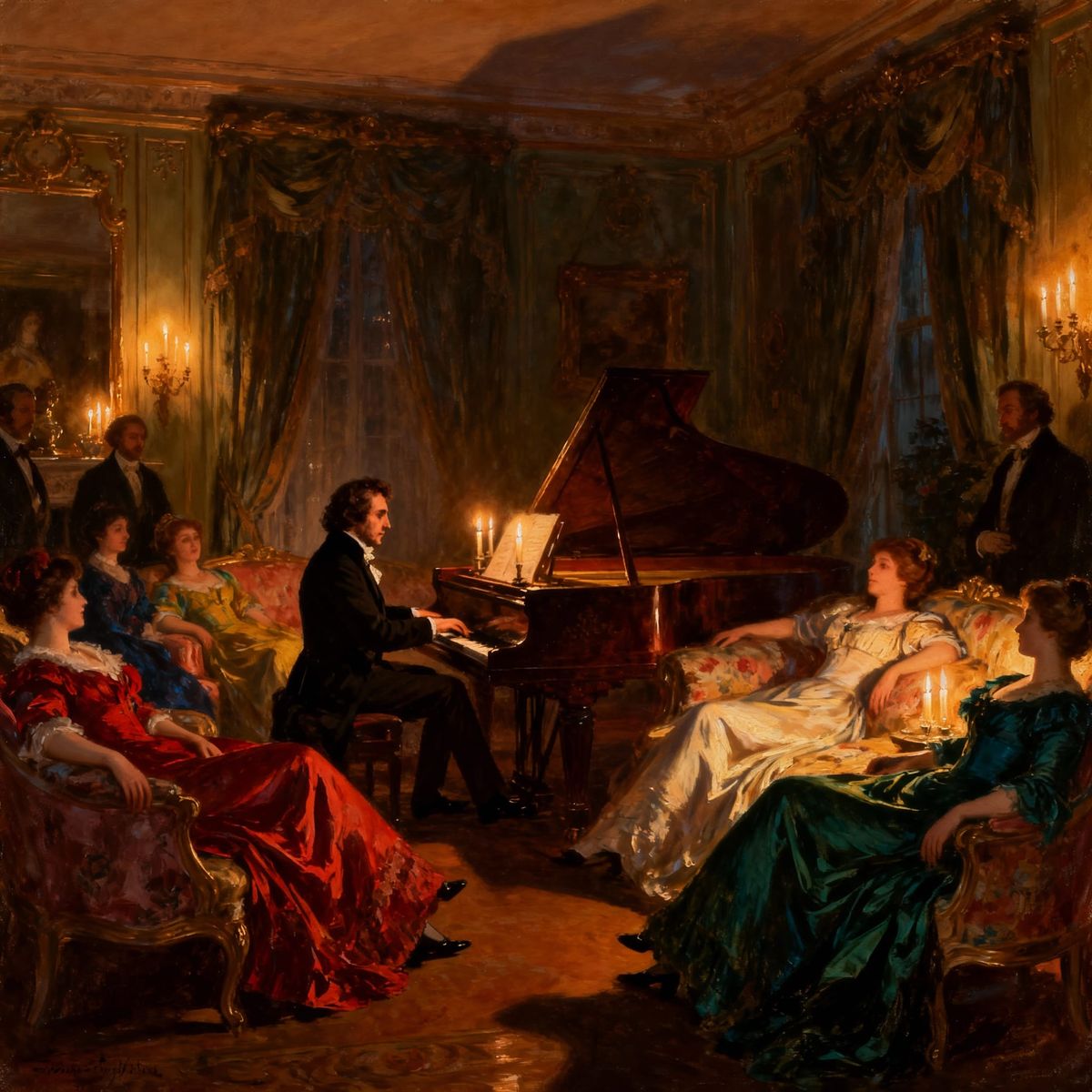 This image depicts Frédéric Chopin playing a grand piano in a richly detailed, candlelit Victorian parlor. Romantic-era oil painting style with dramatic chiaroscuro lighting evokes an intimate atmosphere.