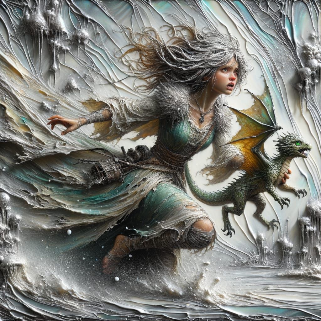 This image shows a Caucasian princess fleeing through a snowy forest with a baby dragon. Rendered in an encaustic painting style, the scene emphasizes wax textures and a palette of silver, white, and aged honey tones.