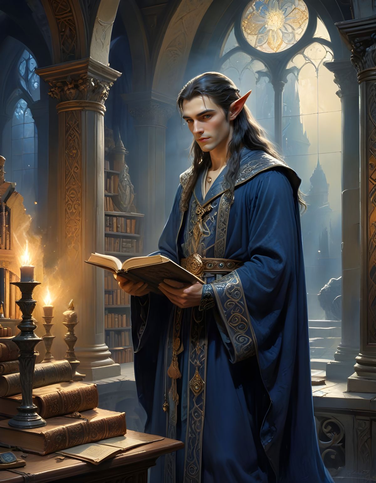 A striking picture of a young elven wizard in a grand library. The wizard wears a blue robe with silver embroidery. The scene is bathed in soft, ethereal light, reminiscent of high fantasy oil painting.