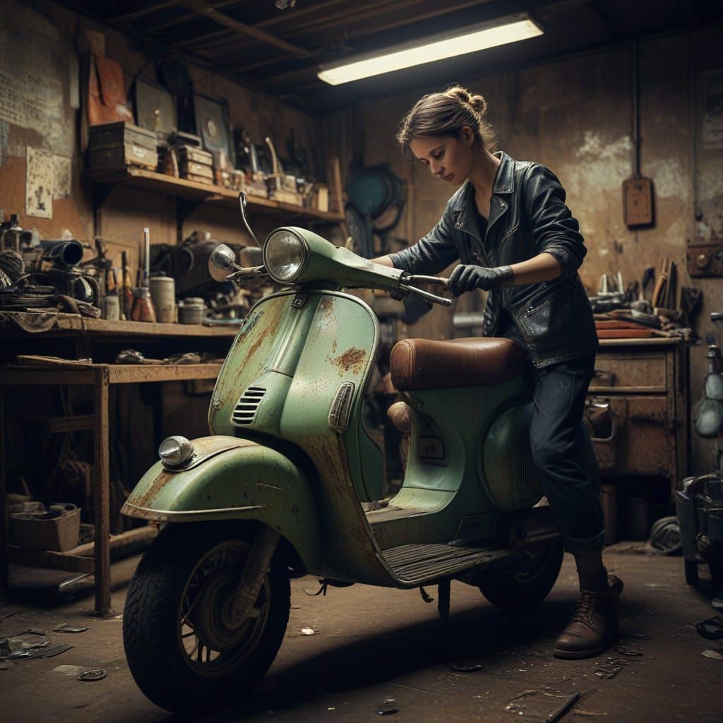 A gritty, cinematic image of a woman repairing a vintage Vespa scooter in a dimly lit repair shop. The scene features rusty textures, oil splatters, and a moody, industrial grunge aesthetic.