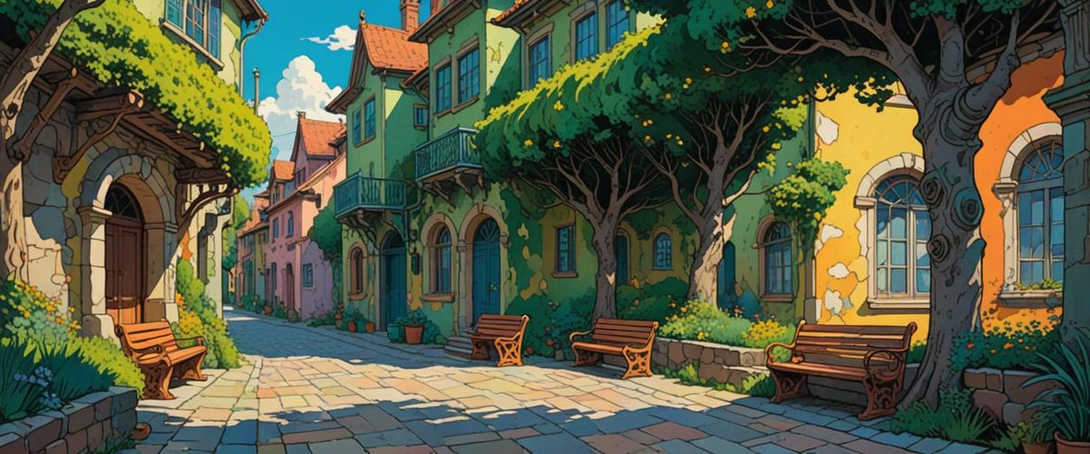 This image shows a quaint village scene with a trolly car and benches, rendered in a vibrant comic book style. The architecture features mossy stone and blue arches, with bright, dreamlike lighting.
