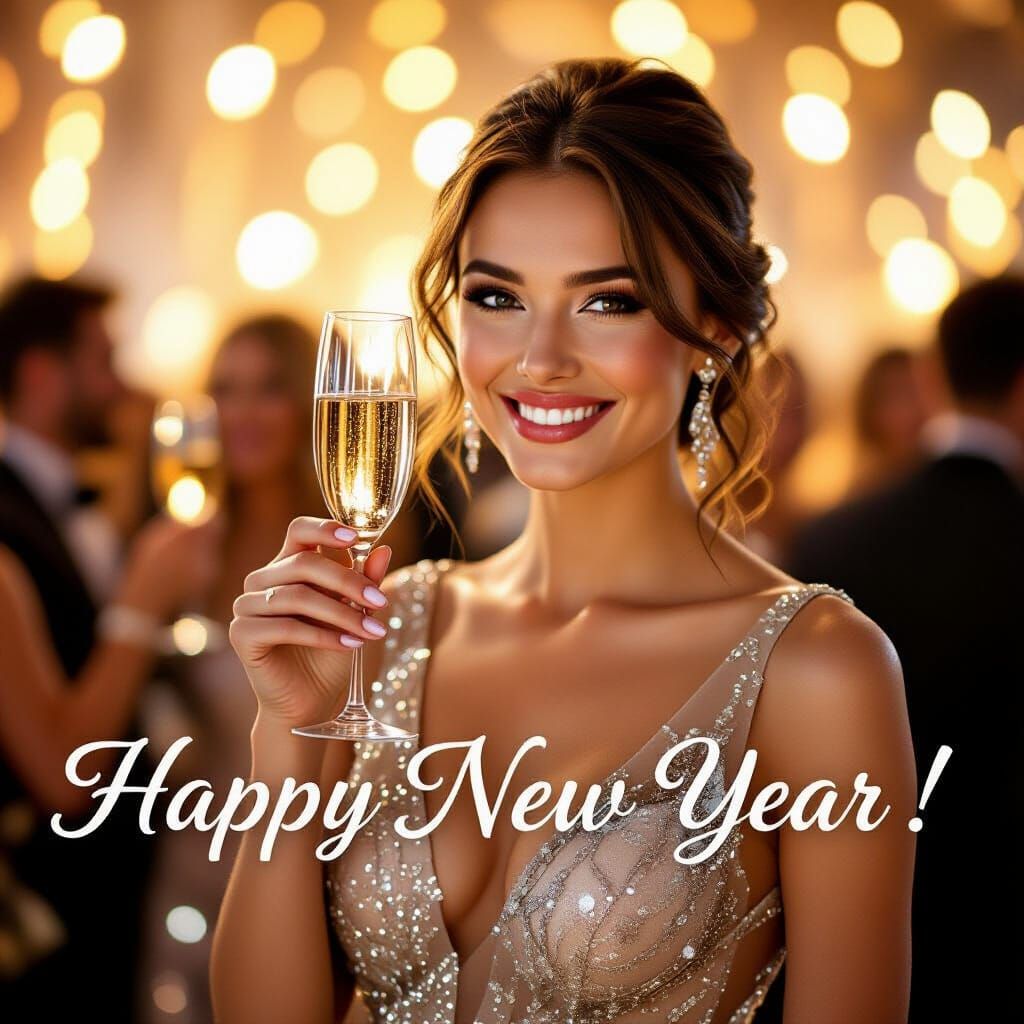 A photorealistic, cinematic image of a smiling woman in a glittering gown holding champagne at a festive New Year's Eve party, with golden hour lighting and bokeh.