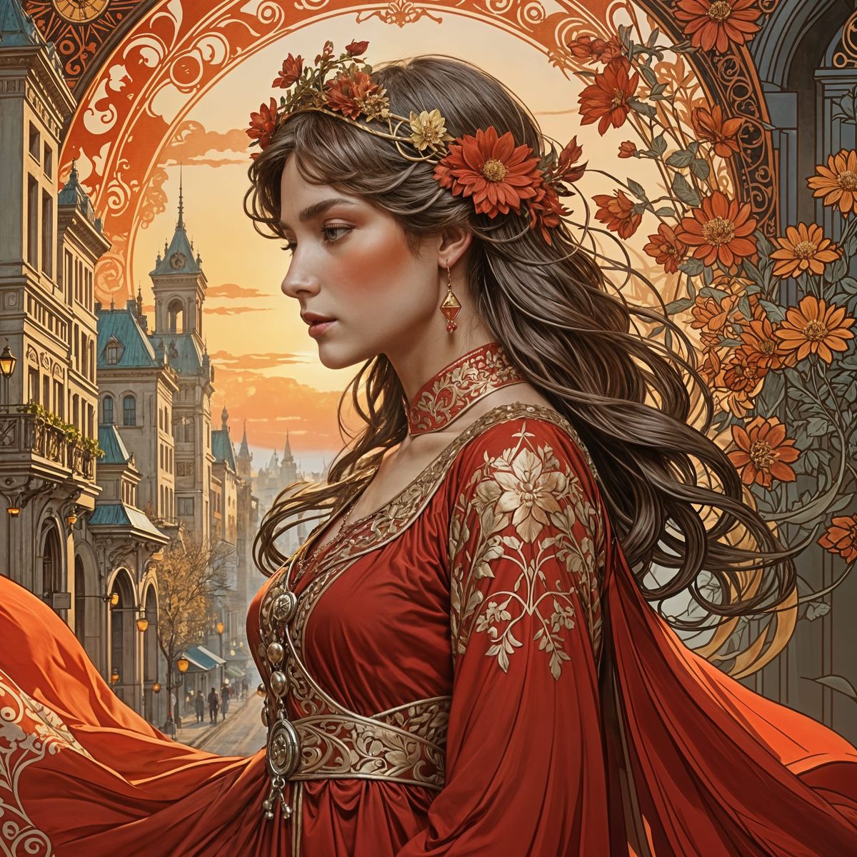 This image depicts a woman in an elegant red dress with gold embroidery on a hazy city street, bathed in warm sunset light. Rendered in the style of Art Nouveau.
