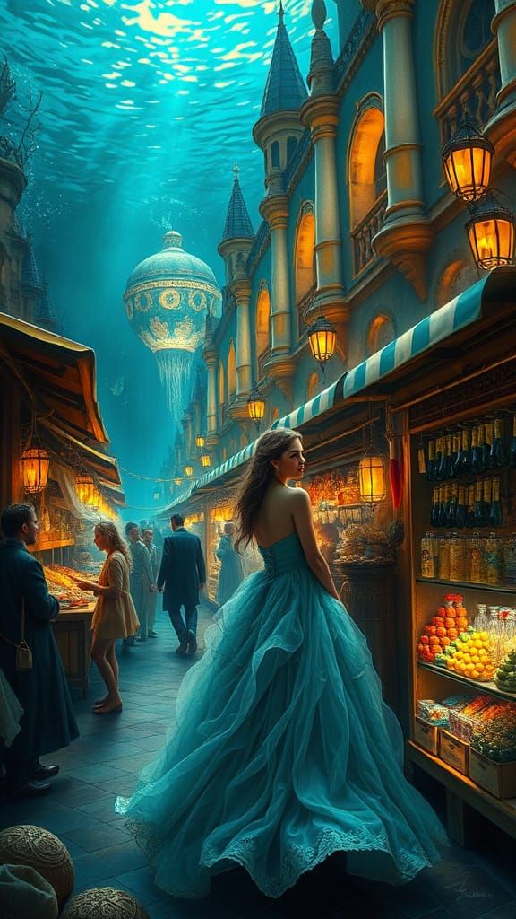 A medieval-style oil painting shows a bustling marketplace in the mythical underwater city of Atlantis. Bioluminescent creatures illuminate stalls filled with exotic goods, creating an enigmatic scene.