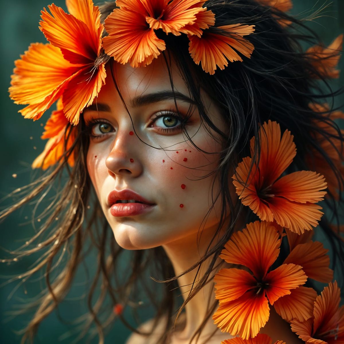 A stunning portrait of a girl surrounded by vibrant orange hibiscus flowers, captured in a cinematic style with hyperrealistic detail and balanced colors.
