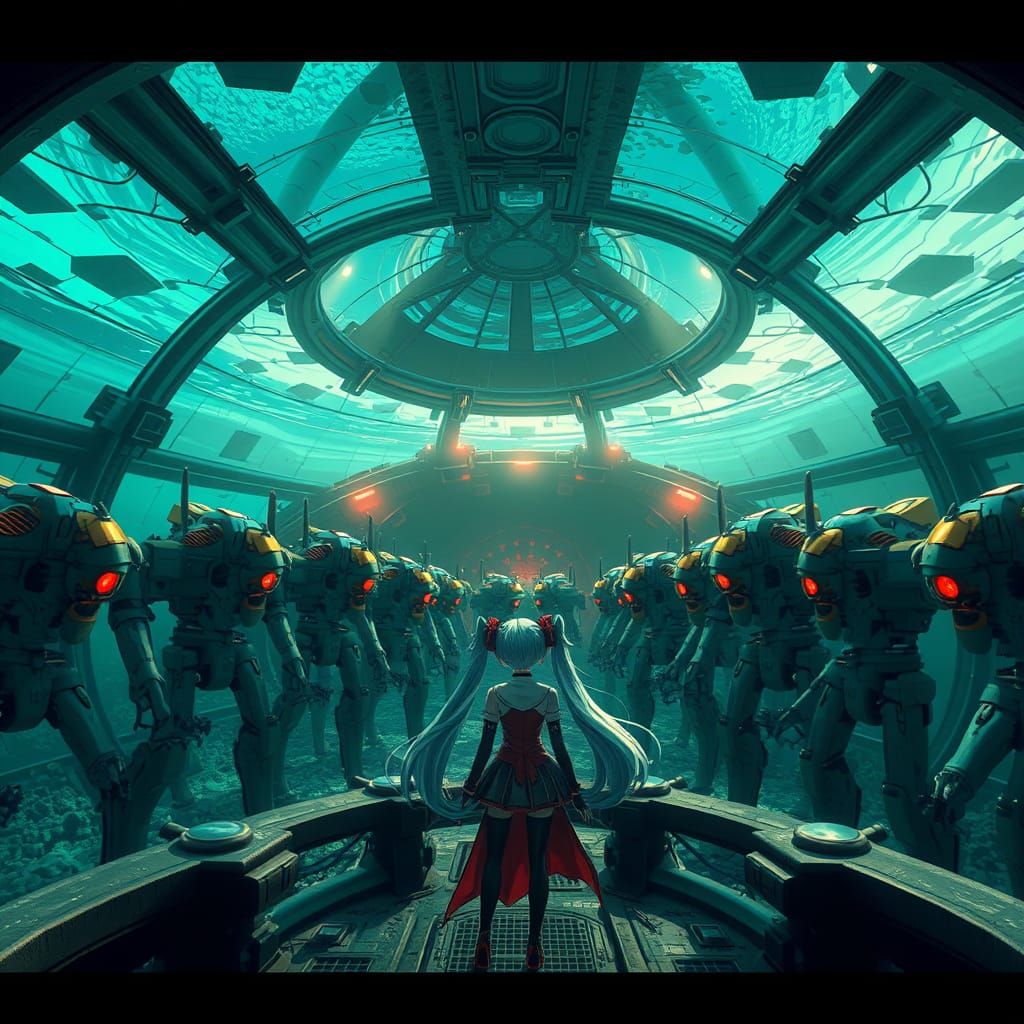Panoramic view of a movie villain's base, an underwater base covered with a transparent dome. Hatsune Miku, in her supervillain role, inspects her robot army under an underwater dome. Supervillain hideout.