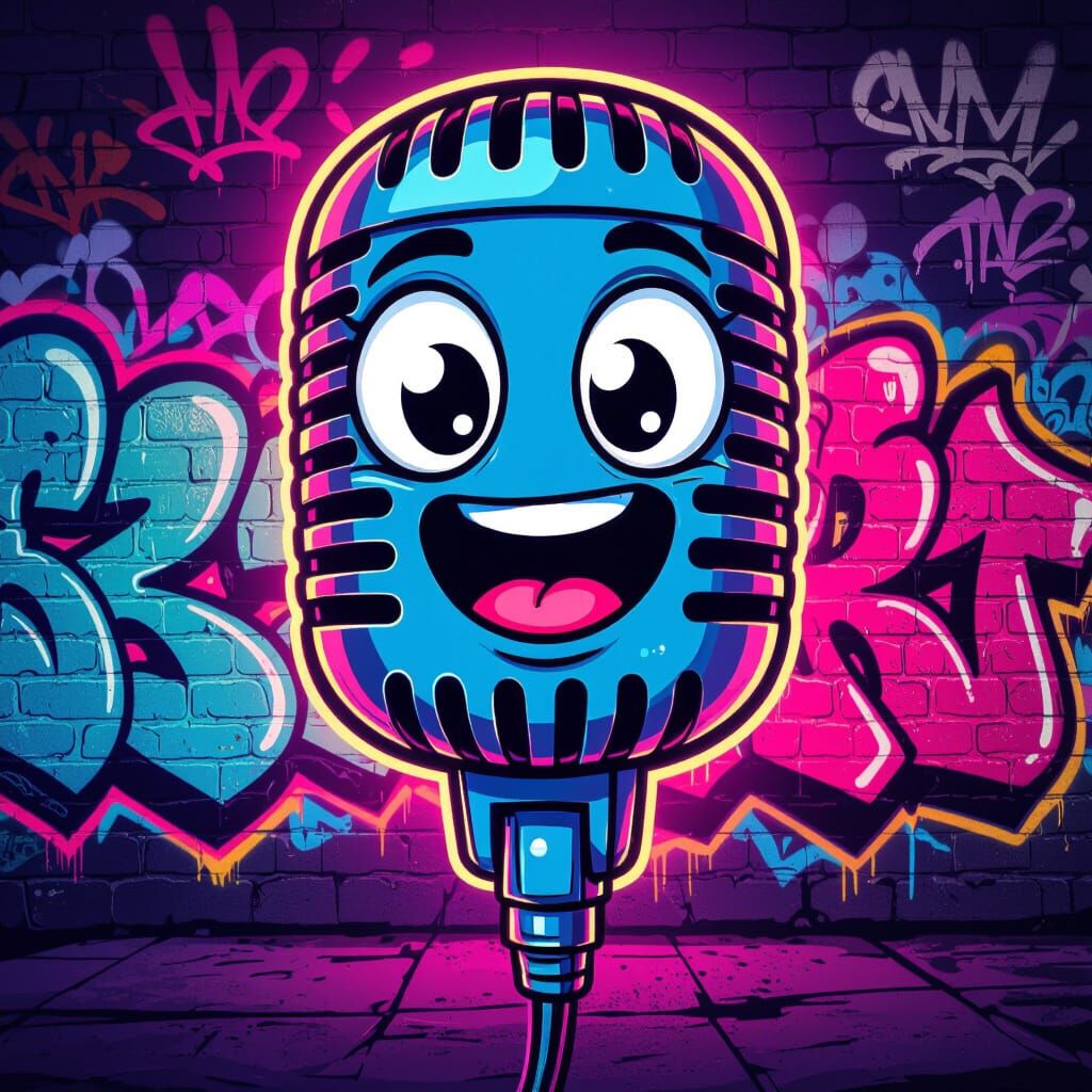 A vibrant cartoon microphone character with expressive features stands out against a bright graffiti backdrop. The image shows urban street art with bold outlines, in a playful aesthetic.