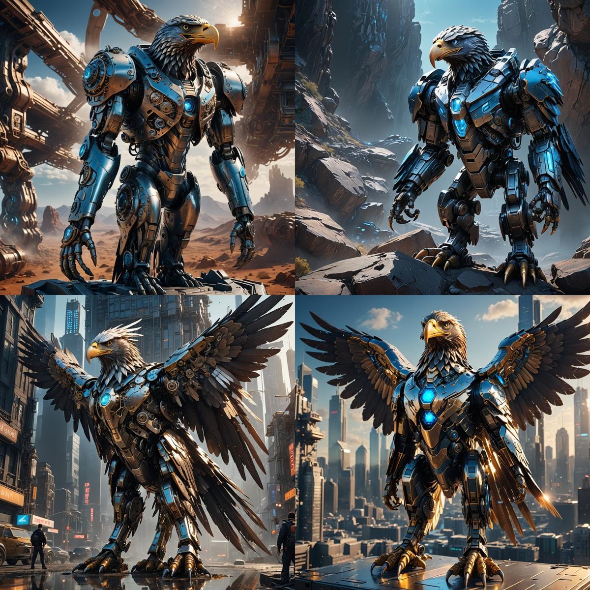 A ground-level view of an AI eagle with intricate mechanical details. The futuristic, sci-fi image features polished metal and a dramatic, cinematic, atmospheric background. Rendered in high definition.