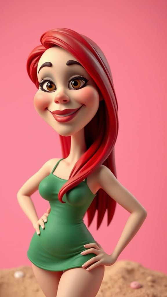 This image shows a 3D claymation-style cartoon caricature of a glamorous 30-year-old woman with red hair in a short green dress. She is posing in a detailed sandbox against a pink background.