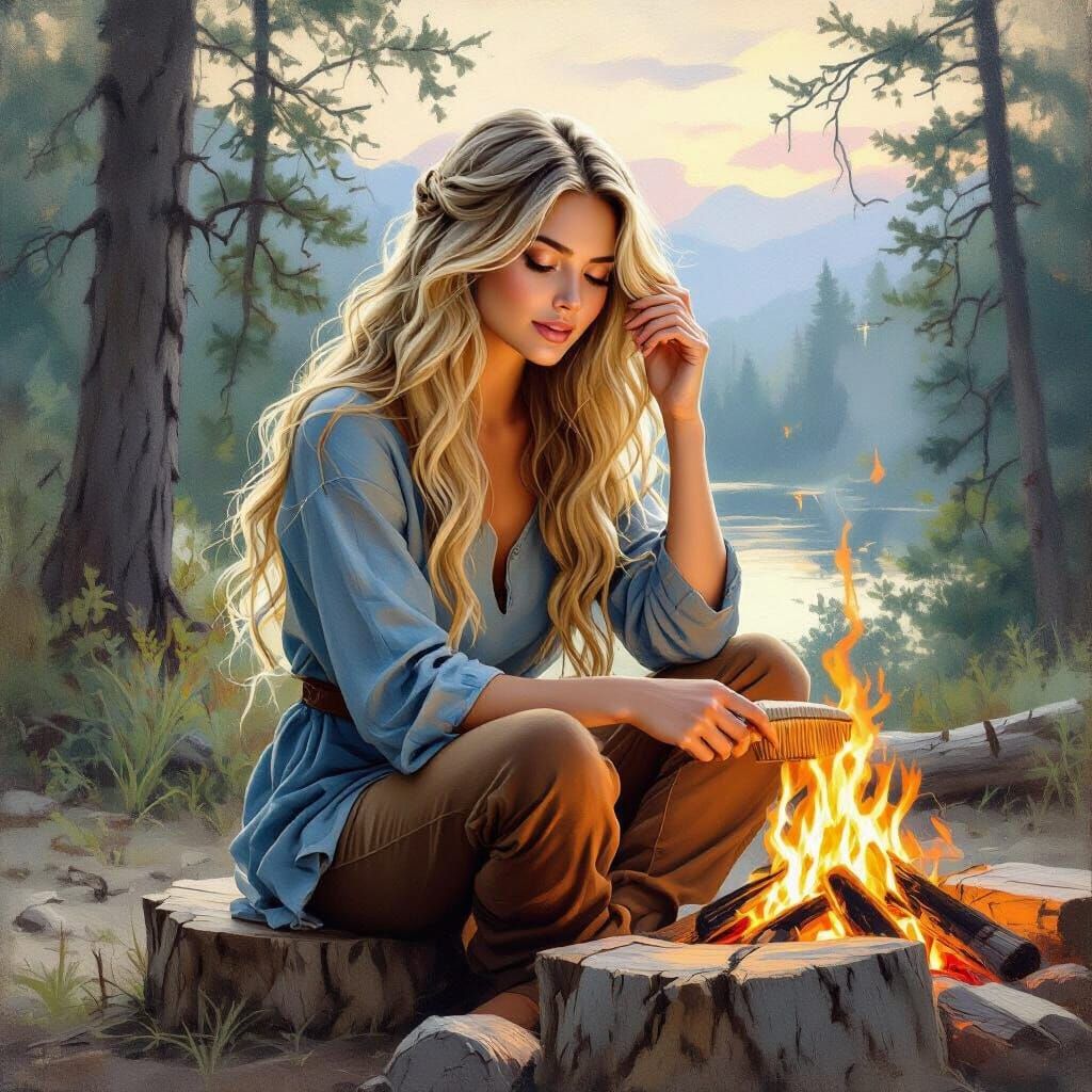 This image depicts a woman with long, wavy ash blonde hair sitting by a campfire, brushing her hair. Rendered in a richly detailed, painterly style with atmospheric lighting.