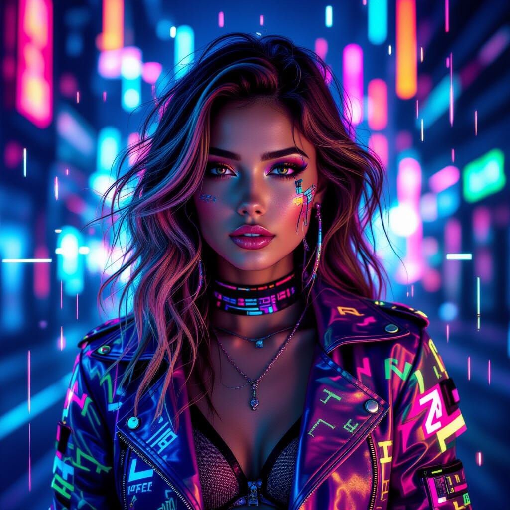 This image shows a vibrant young woman in neon clothing, flickering between realities. Pixel tears and digital distortions surround her in a glitchcore aesthetic with a futuristic, cyberpunk style.