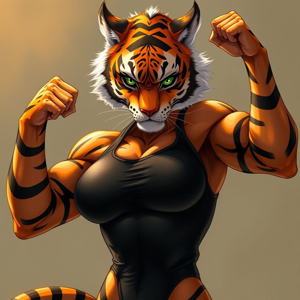 A dynamic anime-style image of a muscular, anthropomorphic tiger woman confidently flexing her toned biceps, with vibrant green eyes and a sleek black tank top, featuring a premium cel-shaded finish and detailed textures.