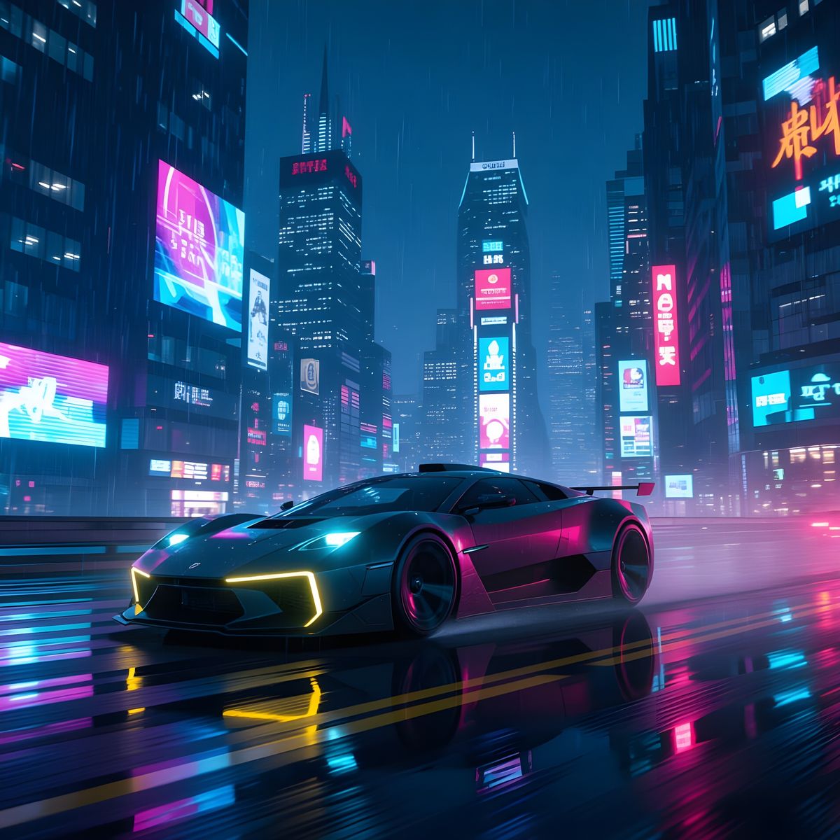 A futuristic vehicle speeds through a vibrant, rainy cityscape at night. Towering skyscrapers and holographic ads line the streets, captured in a cinematic, photorealistic style.