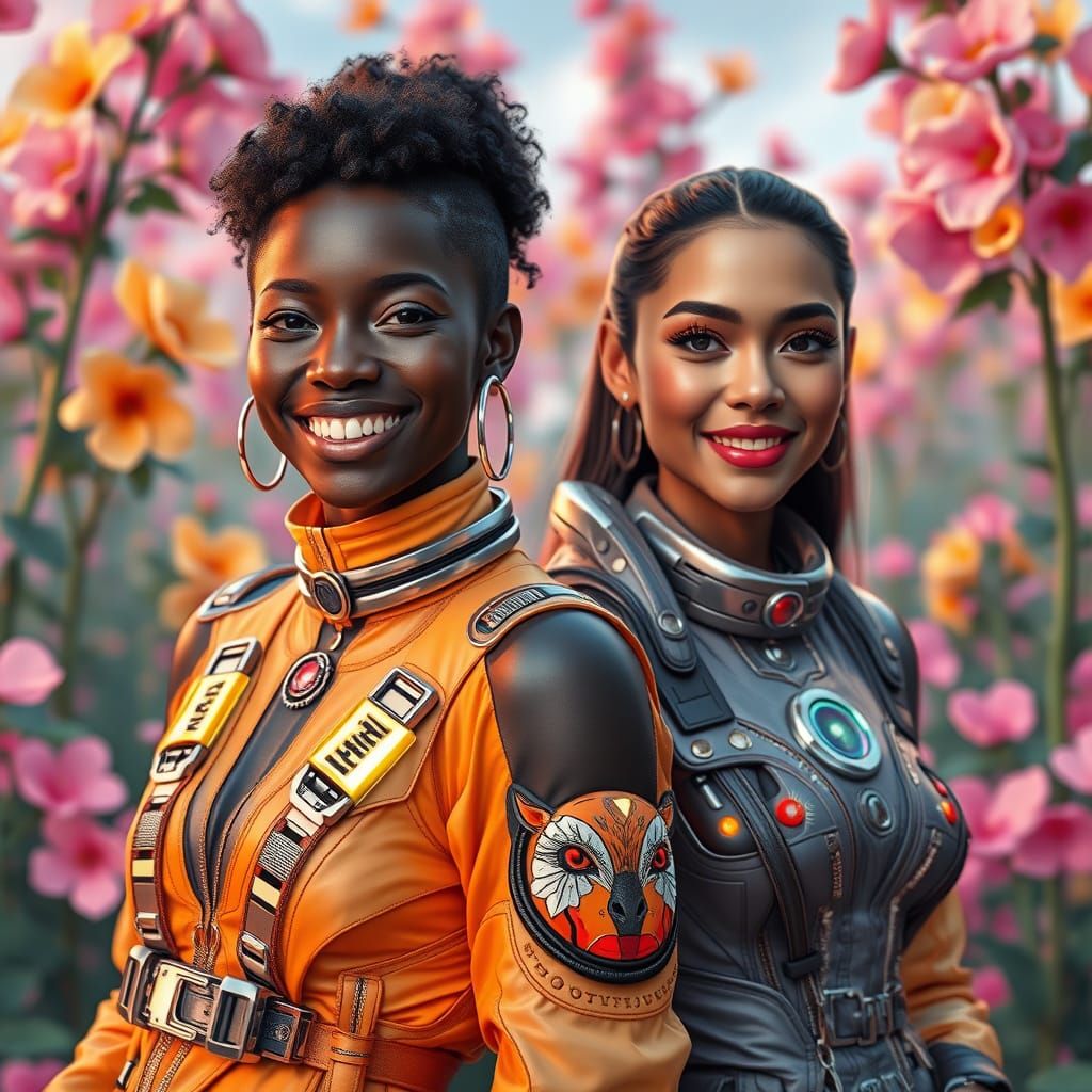 This image shows two women in futuristic streetwear standing side-by-side. The scene blends futuristic elements with a surreal, vibrant world reminiscent of Takashi Murakami, using photorealistic techniques and organic textures.