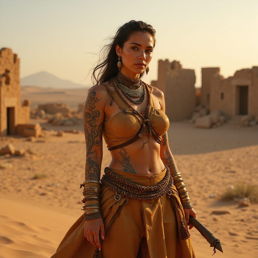 Easily design your own desert warrior woman images with our free AI image generator, featuring intricate tribal tattoos and ancient ruins.