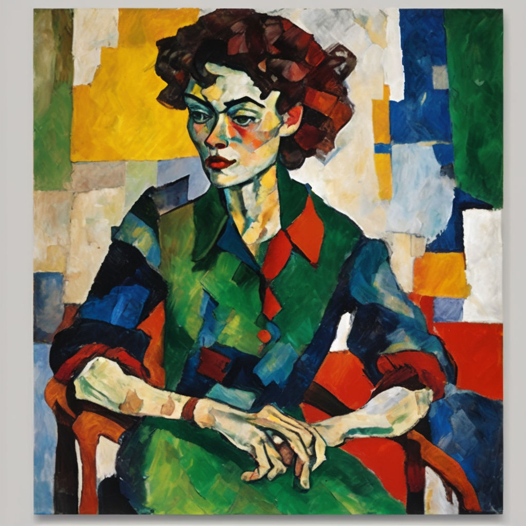 This image depicts a seated young woman in a striking German Expressionist style. Bold colors are used to evoke a sense of modernity and raw emotion.