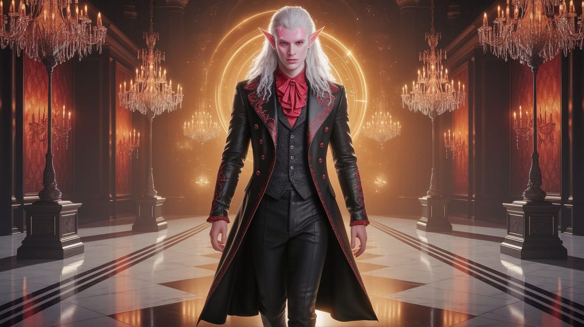 This image showcases a tall, lean elf with white hair and pink eyes, wearing a black leather coat with red sigils and a red shirt. The scene is set in an enchanted elvish ballroom with warm lighting, rendered in an Art Nouveau style.