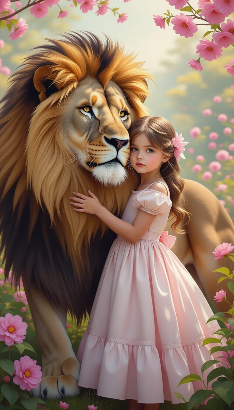 A hyperrealistic image of a young girl in a pastel dress resting against a regal lion in a lush garden. The artwork features detailed matte painting and deep, complementary colors, similar to fantasy concept art.